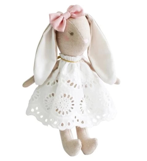 This Alimrose Baby Broderie Bunny 25cm is a great companion to our mummy broderie bunny. She will become your treasured keepsake. Suitable from 3 years.