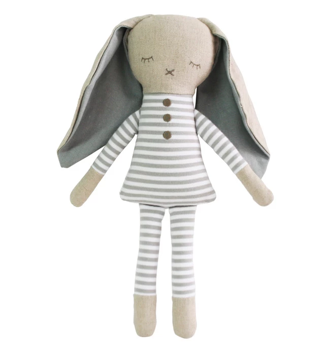 The Alimrose Bedtime Bunny Boy featuring an asleep face on one side and an awake face on the other side. This sweet bunny fits well into our carry cases and carriers for dolls and toys.Made from cotton and linen, with embroidered details.