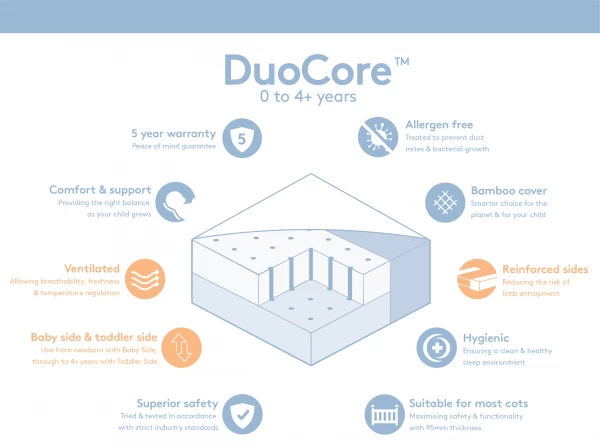 - Suitable from newborn, the DuoCore mattress features a Baby Side, & Toddler Side, both of which have been tested to Standard AS/NZS 8811.1:2013 for Firmness of Sleep Surfaces. The combination of optimal firmness & comfort ensures safety & support from birth, right through to their first big bed.