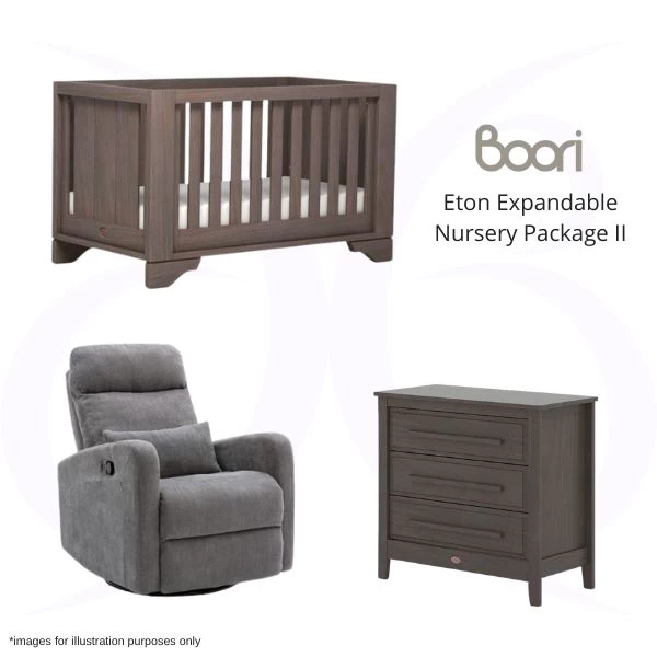The Boori Eton Expandable Nursery Package II includes the Boori Eton Expandable Cot, Pocket Spring Mattress, Linear 3 Draw Chest & Glider.