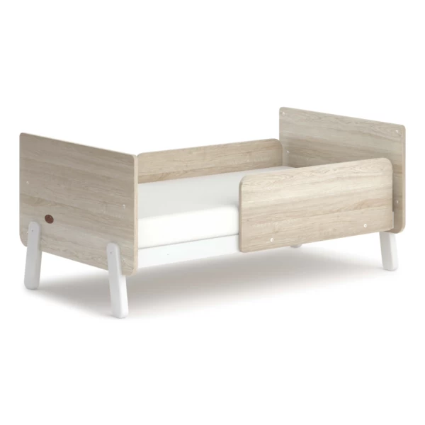 The Boori Natty Cot Bed offers a modern and functional cot bed with rounded corners, playful angled feet and a muted two-tone oak-effect finish.