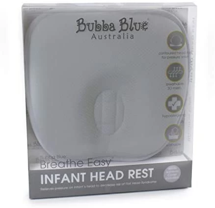 The Bubba Blue Breathe Easy® Infant Head Rest Grey is not a traditional pillow and does not lift baby’s head. Rather, its contoured design gently supports Baby’s head and relieves negative pressure on Baby’s soft skull to help prevent Flat Head Syndrome, whilst still enabling baby to move their head naturally.