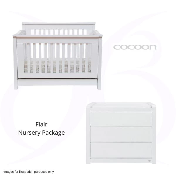 The Cocoon Flair Nursery Package includes the Flair 5 in 1 Cot, Toddler Rail, Mattress & Flair Chest Changer.