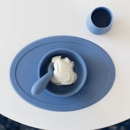 The EZPZ First Foods Tiny Set is designed to fit on the tiniest of highchair trays, including the Stokke Tripp Trapp and Boon Flair trays.