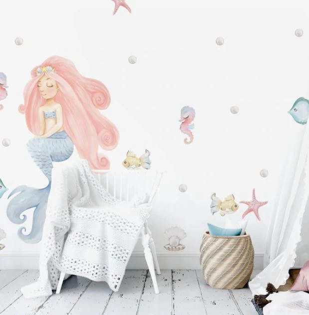 This Ginger Monkey Wall Decal Mermaid Princess will add a touch of magic to any little girls room or nursery! Hand painted in graphite and watercolour by a local Melbourne artist. These decals are made to look like they have been hand painted onto your wall (see detail pic). The decals are printed full colour onto a peel and stick, polyester fabric material.