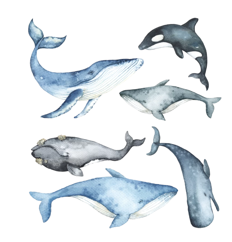6 x large watercolour whales (ranging from 96cm-55cm wide) all in soft muted shades of blue and grey.