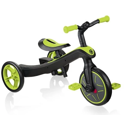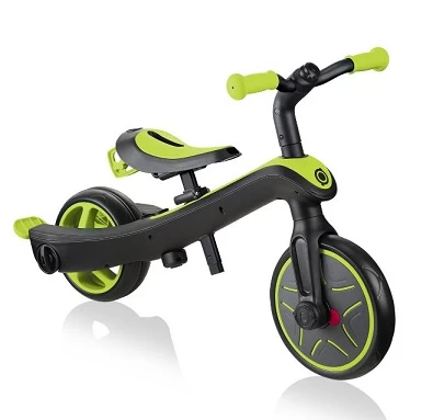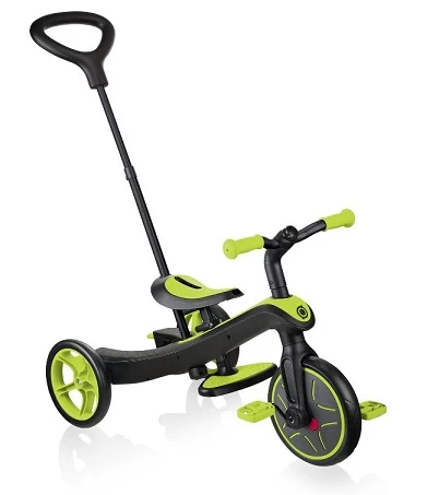 The Globber Explorer Trike 4 in 1 Lime Green is the ALL-IN-ONE DESIGN EXPLORER TRIKE is equipped with our patented wheel mechanism to easily and quickly convert the two rear wheels into a double width wheel without any tools, to transform the product from a tricycle to a balance bike!