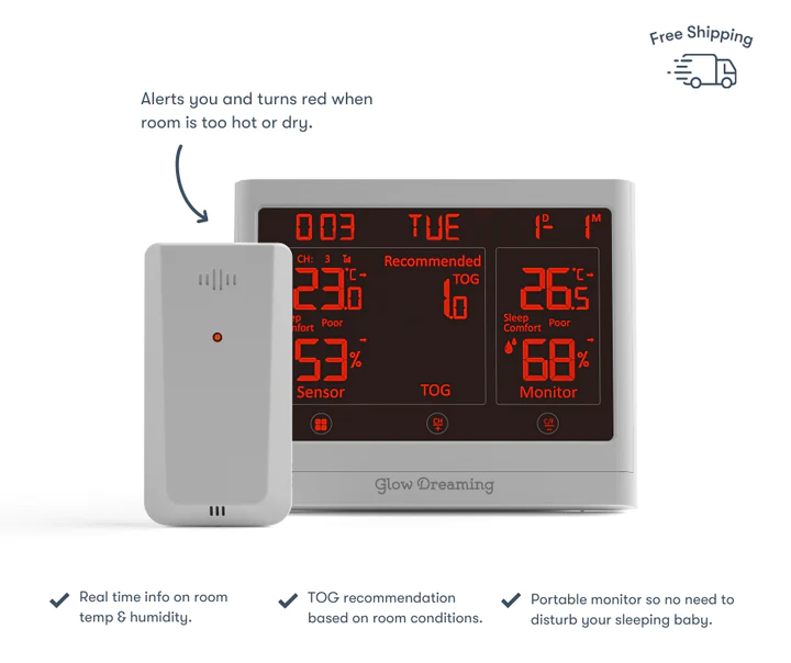 Glow Dreaming Perfect Sleep Sensor allows you to monitor this from anywhere in the house, ensuring conditions are always conducive for a safe and comfortable sleep.Our smart sensor technology will inform you of the best TOG based on the conditions of your child’s sleep space, not based on the weather outside. Easy to set up and use with each sensor being fully portable so you don’t need to disturb your little one when you want to check the room conditions.