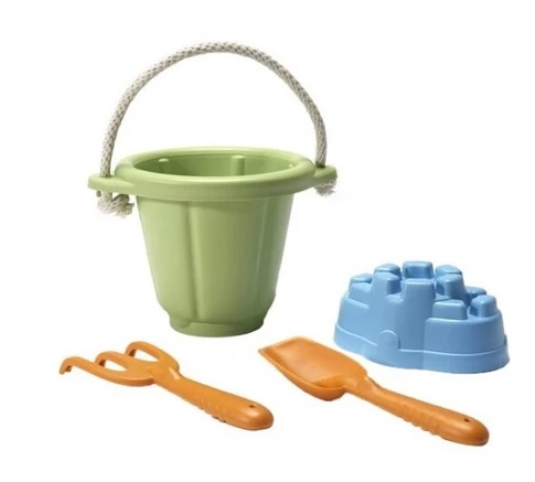 The Green Toys Sand Play Set is made from 100% recycled plastic and can be carried to the park or beach with its US-made 100% cotton rope.
