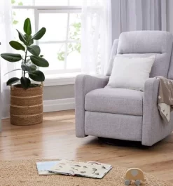 This stylish glider chair also includes a smooth swivel motion and gently and effortlessly glides back and forth to help soothe your baby to sleep.