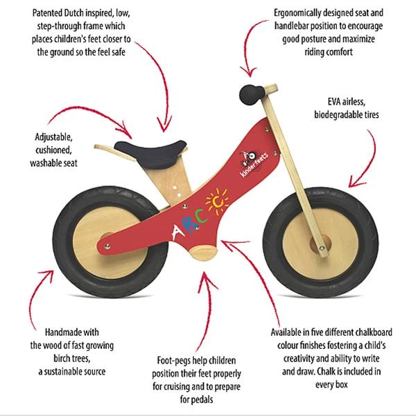 The Kinderfeets Balance Bike Black with chalkboard finish allowing kids to decorate the bike in their own unique style. Ergonomically designed seat and handlebar position to encourage good posture and maximise comfort. Washable cushion seat. Adjustable seat height: 30.5 to 38 cms. EVA airless biodegradable tires. Foot pegs to help children position their feet properly for cruising and to prepare for pedals.