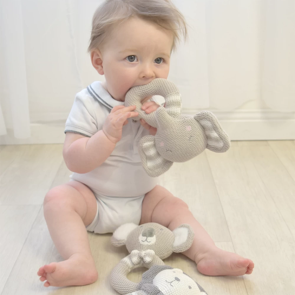 The Living Textiles Knitted Rattle Eli The Elephant is made from 100% cotton knit and featuring a soft jingling rattle, Eli sure to be instantly loved by baby.