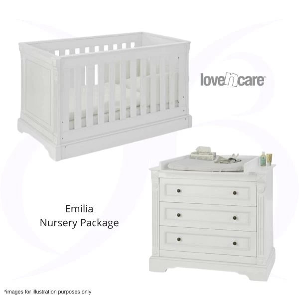 The Love n Care Emilia Nursery Package I includes the Emilia Cot, Innerspring Mattress, Emilia Chest & Changer.
