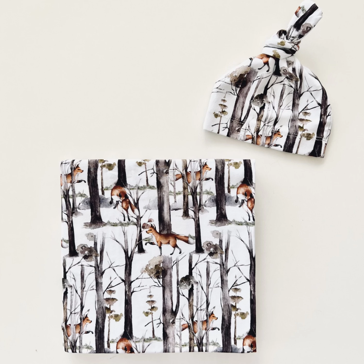 The Mini & Me Baby Wrap Set Fox Hunt is luxuriously soft & stretchy. It comes with a matching topknot headband, perfect for your newborns birth announcement.