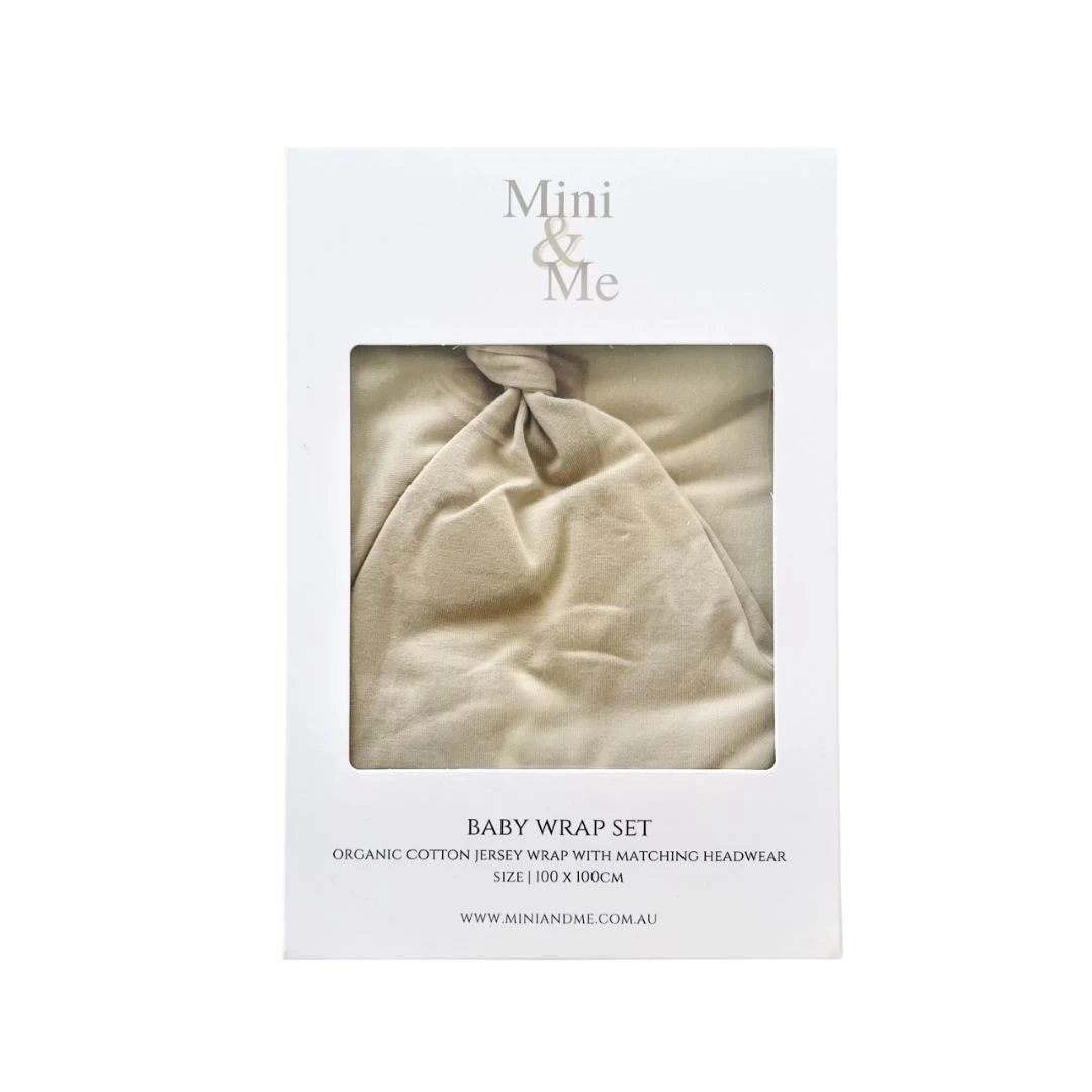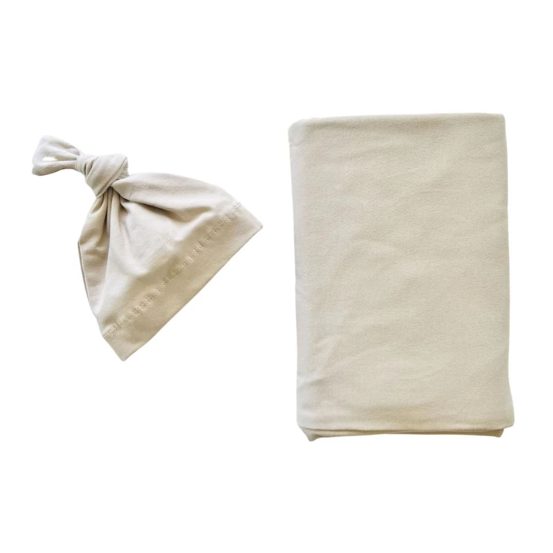 The Mini & Me Baby Wrap Set Nude is luxuriously soft & stretchy. It comes with a matching topknot headband, perfect for your newborns birth announcement.