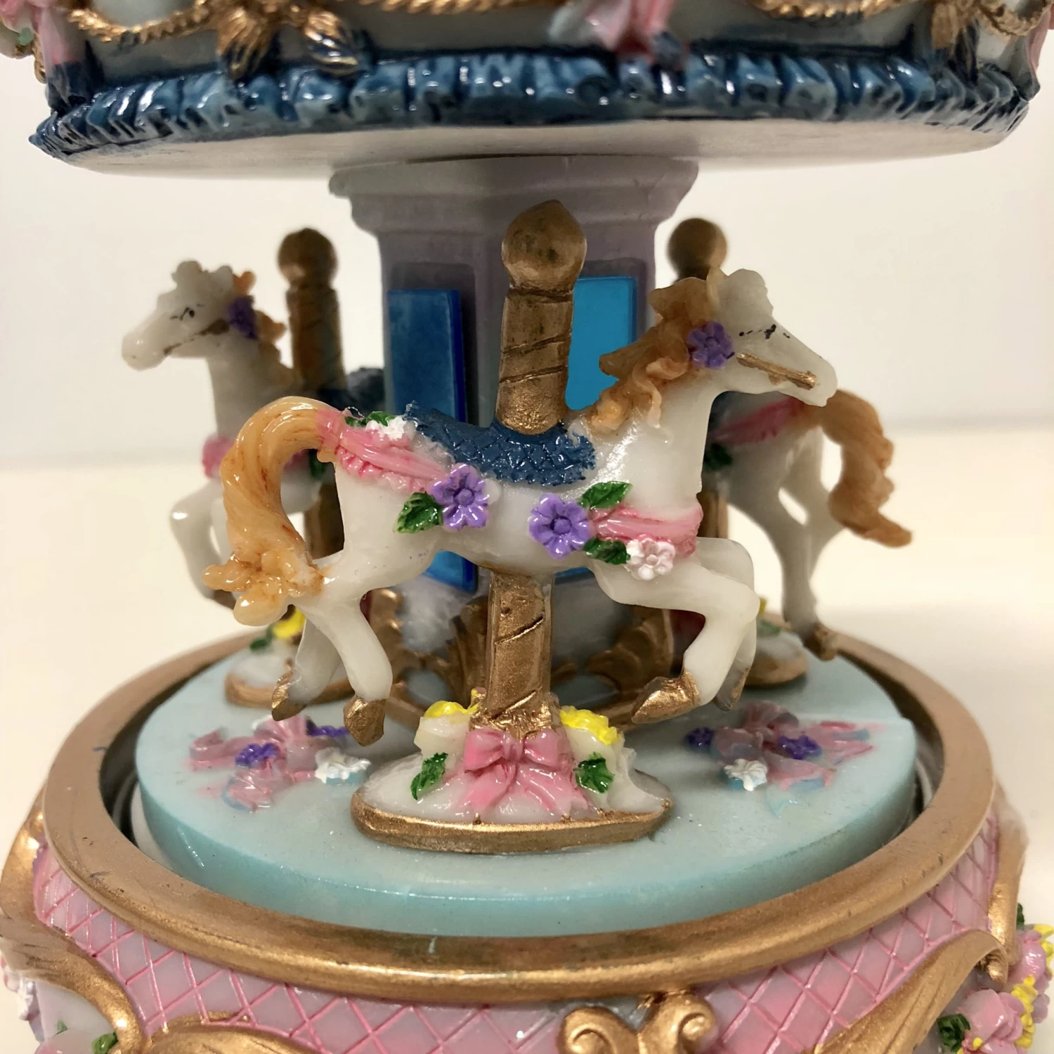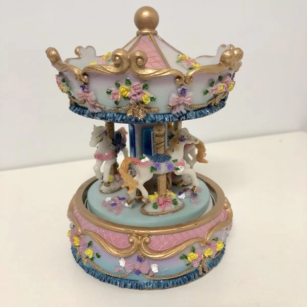 Simply wind the Musical Carousel 3 Horses Pink & Blue to hear music play and watch the fairy’s ride around on horses. It makes a beautiful keepsake.