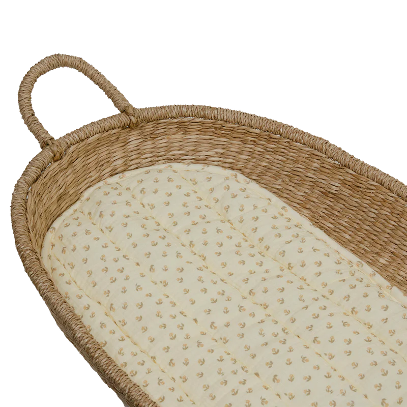The Olli Ella Luxe Organic Cotton Liner Leafed Mushroom soft & lightly padded, it fit’s perfectly in all of Olli Ella’s Changing Baskets.