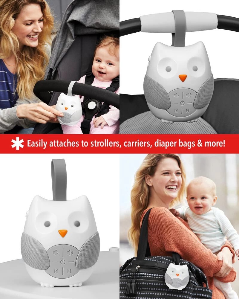 The Skip Hop Stroll & Go Portable Baby Soother attaches to strollers, nappy bags and more with a handy silicone strap.
