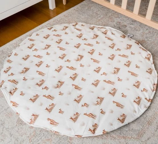 The Snuggly Jacks Playmat Fawn is made from 100% cotton fabric ensuring the safety of your baby. Measuring 100cm in diameter. Perfect to throw on the floor and use at Tummy time, this playmat is just the perfect thickness to offer a soft surface but to still allow your baby to move freely when they are learning to sit and crawl.