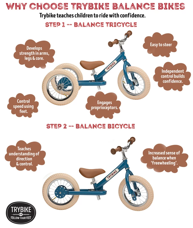 The Trybike Steel 2 in 1 Balance Bike Vintage Blue is made from steel makes learning to ride fun! The Trybike Steel teaches children to ride from 18 months of age.